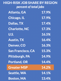 Our research finds that there are 300,000 jobs in high-risk industries in the Greater MSP region, accounting for 14.2% of total metro employment. This share of jobs in high-risk industries places the Greater MSP region below the national share (16.5%) and below nearly all of our peer regions.
