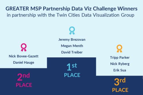 This was a great experience and we value the time and attention of participating teams on this work. A special thank you to the Twin Cities Data Viz Group organizers for working with us on the challenge. Another big thanks to our expert judging panel, B Kyle, President/CEO of the Saint Paul Area Chamber of Commerce, Allison Liuzzi, Project Director of Minnesota Compass at Wilder Research, and Eric Muschler, Program Officer for the McKnight Foundation’s Vibrant & Equitable Communities program. Our judges have been intimately involved in the creation and upkeep of the Regional Indicators Dashboard and understand the power and opportunity of analyzing this data to drive action in the region.