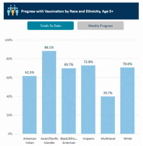 As of April 2nd, data shows that Minnesotans who identify as multiracial continue to experience the largest disparities in vaccination rates across all age groups. The share of adults having received at least one dose of vaccine remains highest among Asian/Pacific Islander Minnesotans than every other racial/ethnic group. In latest available data, 88.1% of Asian/Pacific Islander Minnesotans aged 5+ had received at least one dose of vaccine, whereas only 39.7% of multiracial Minnesotans had received a dose of vaccine. The State of Minnesota has advanced several strategies to improve equitable vaccine distribution, including partnerships with Federally Qualified Health Care Centers, which are vaccinating indigenous and communities of color at significantly higher rates than other sites, early expansion of the vaccine to community pharmacies and community vaccination sites, and deployment of mobile vaccination units to hard-to-reach populations.